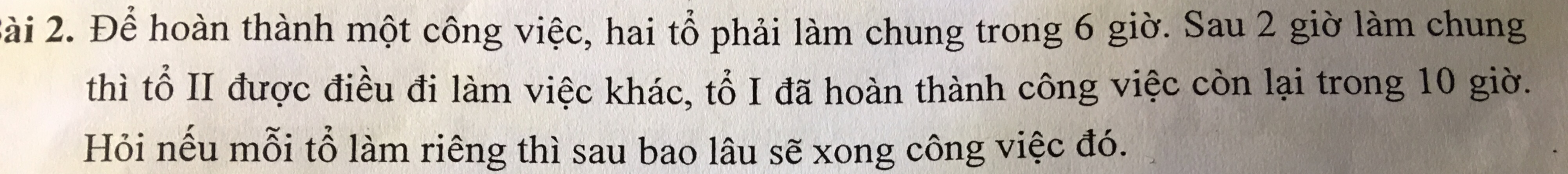 Giải thích các bước giải: 2 giờ, đội đã làm được 1/3 công việc. Tổ I phải hoàn thành 2/3 công việc trong 10 giờ