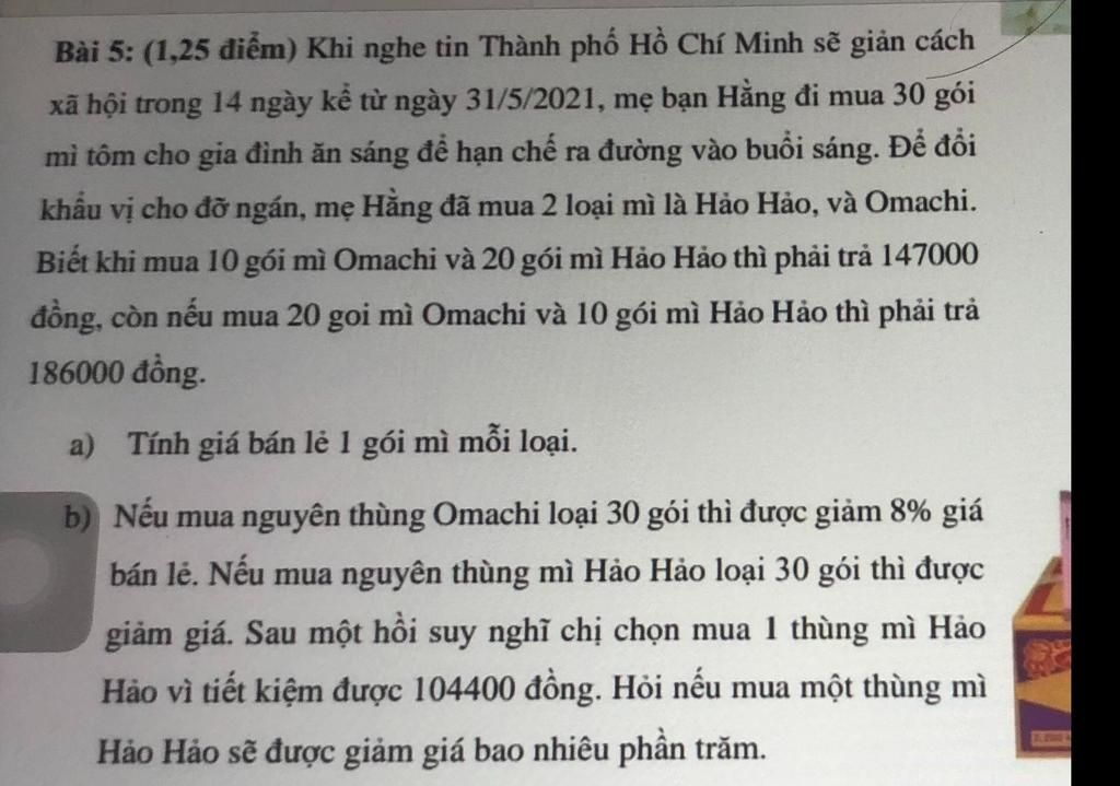 a) Gọi x, y lần lượt là giá tiền của 1 gói mì Omachi, Hảo Hảo (đồng) (147000, 186000 > x,y > 0)