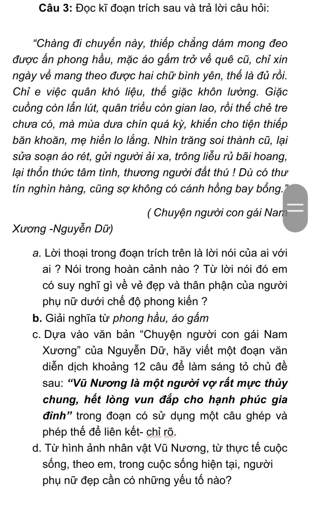 a. Là lời của Vũ Nương nói với Trương Sinh trong hoàn cảnh Vũ Nương tiễn Trương Sinh lên đường đi lính.