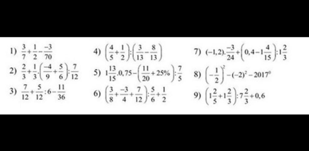 `6)` `(3/8 + (-3)/4 + 7/12) : 5/6 + 1/2`
