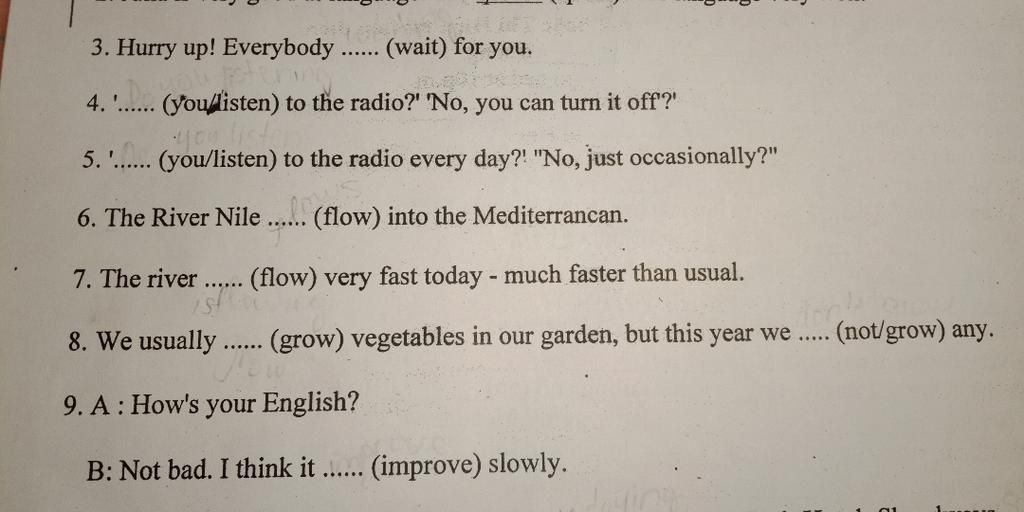 5. '. (you/listen) to the radio every day? "No, just occasionally?"