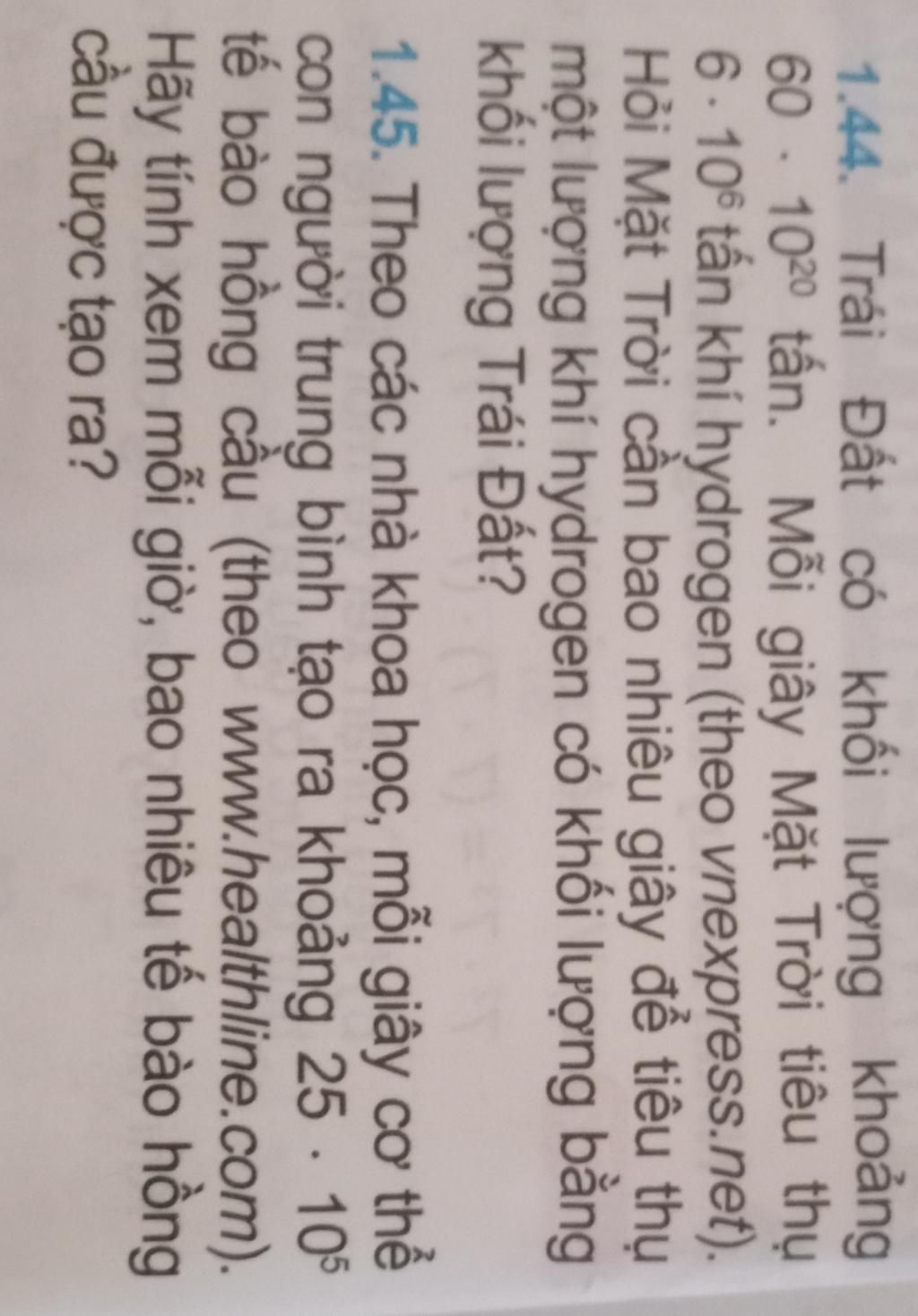 $\text{Đổi $60.10^{20}=6.10.10^{20}=6.10^{21}$}\\\text{Mặt Trời cần số giây để tiêu thụ một lượng khí hydrogen có khối lượng bằng Trái Đất là:}\\(6.10^{21}):(6.10^6)=10^{15}(giây)$