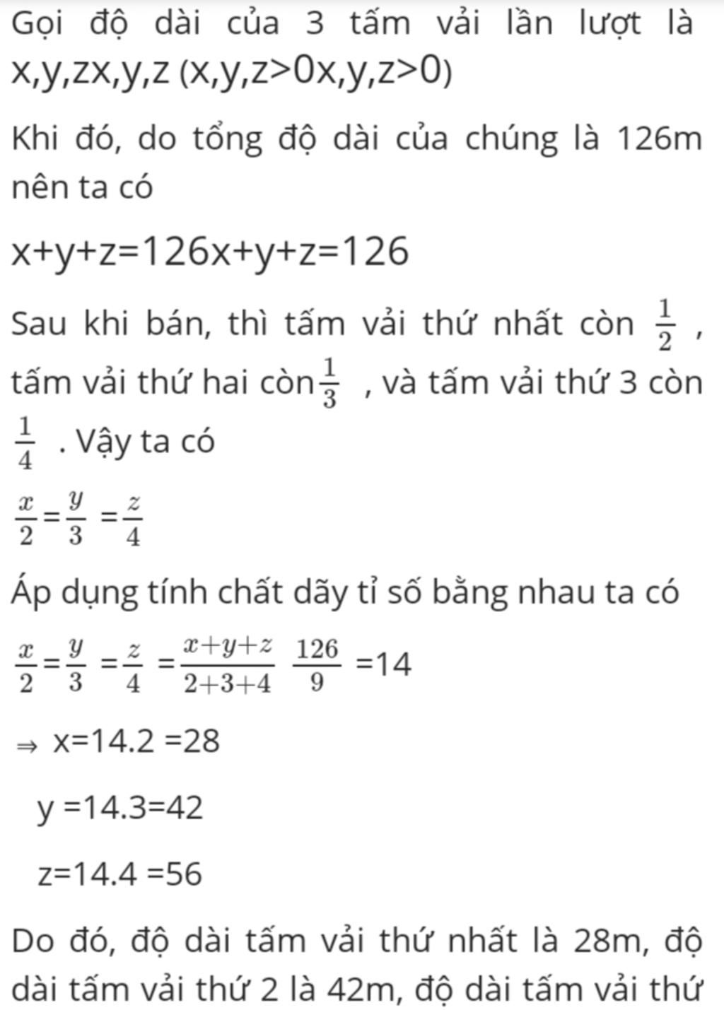 `text{Vậy tấm thứ 1 là 28m, tấm thứ 2 là 42m, tấm thứ 3 là 56m.}`