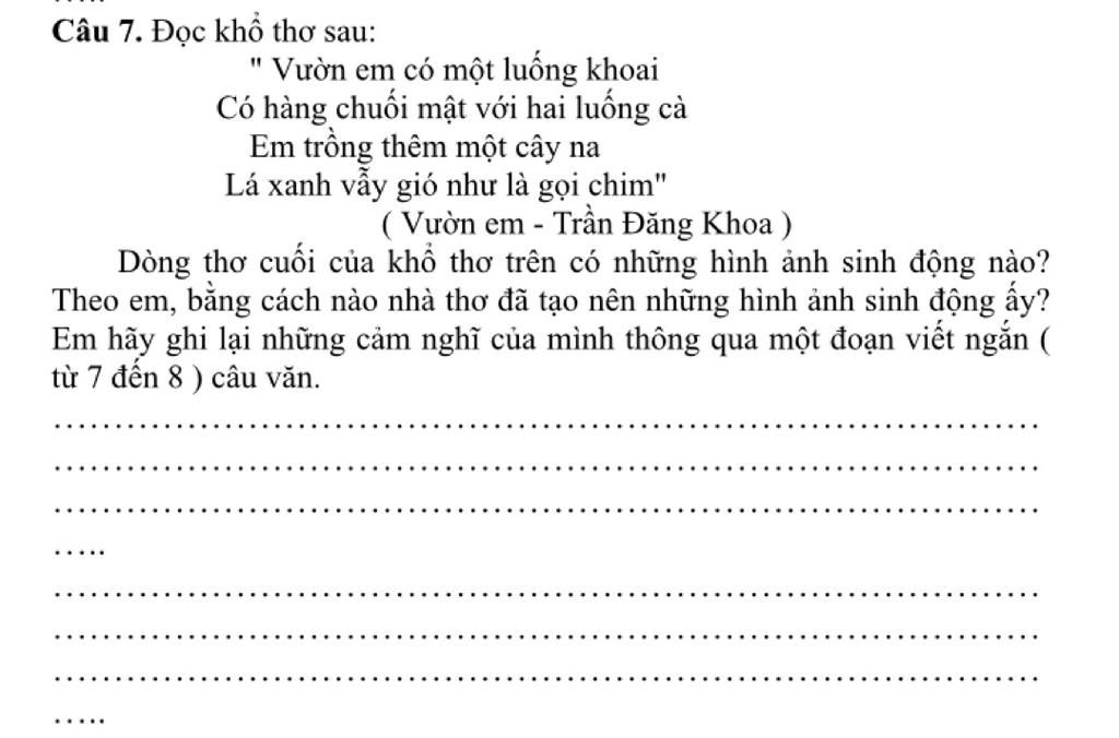 Đọc đoạn thơ "Vườn em" của Trần Đăng Khoa, em thấy thật xúc động. Hình ảnh vườn là hình ảnh đẹp, bình dị, gần gũi ở làng quê Việt Nam. Khu vườn không có những loài cây quý, xa hoa, trang trọng. Mà vườn cây gia đình đơn giản với luống khoai, với hàng chuối, với luống cà, với cây na,...Nghệ thuật liệt kê đã mở ra hình ảnh khu vườn xum xuê, trĩu quả. Đồng thời, ta còn cảm nhận được tình cảm rất mực yêu quý, trân trọng của tác giả dành cho khu vườn. Khu vườn rộn rã, ngập tràn hương sắc đã trở thành nơi bình yên để em có thể thỏa thuê ngắm nhìn.