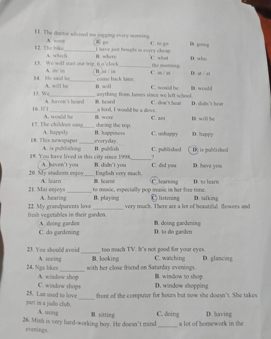 Câu 26: A. Making, B. Reading, C seeing, D. Doing