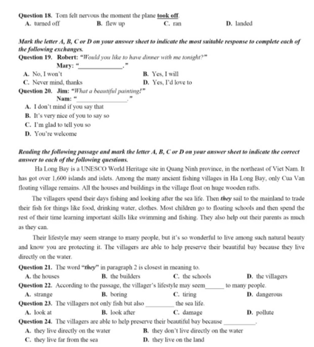 18. D take off: cất cánh >< land: hạ cánh