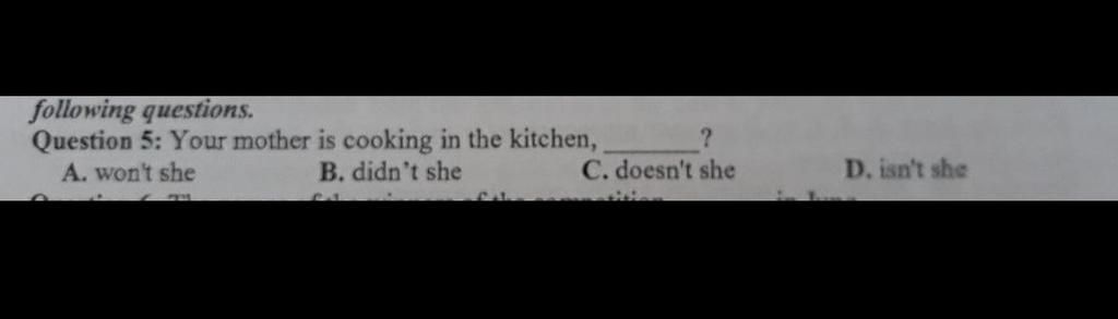 D nha bạn🥰 đây là câu hỏi đuôi vì phía trước là dạng khẳng định của tobe nên phía sau sẽ là phủ định của tobe.