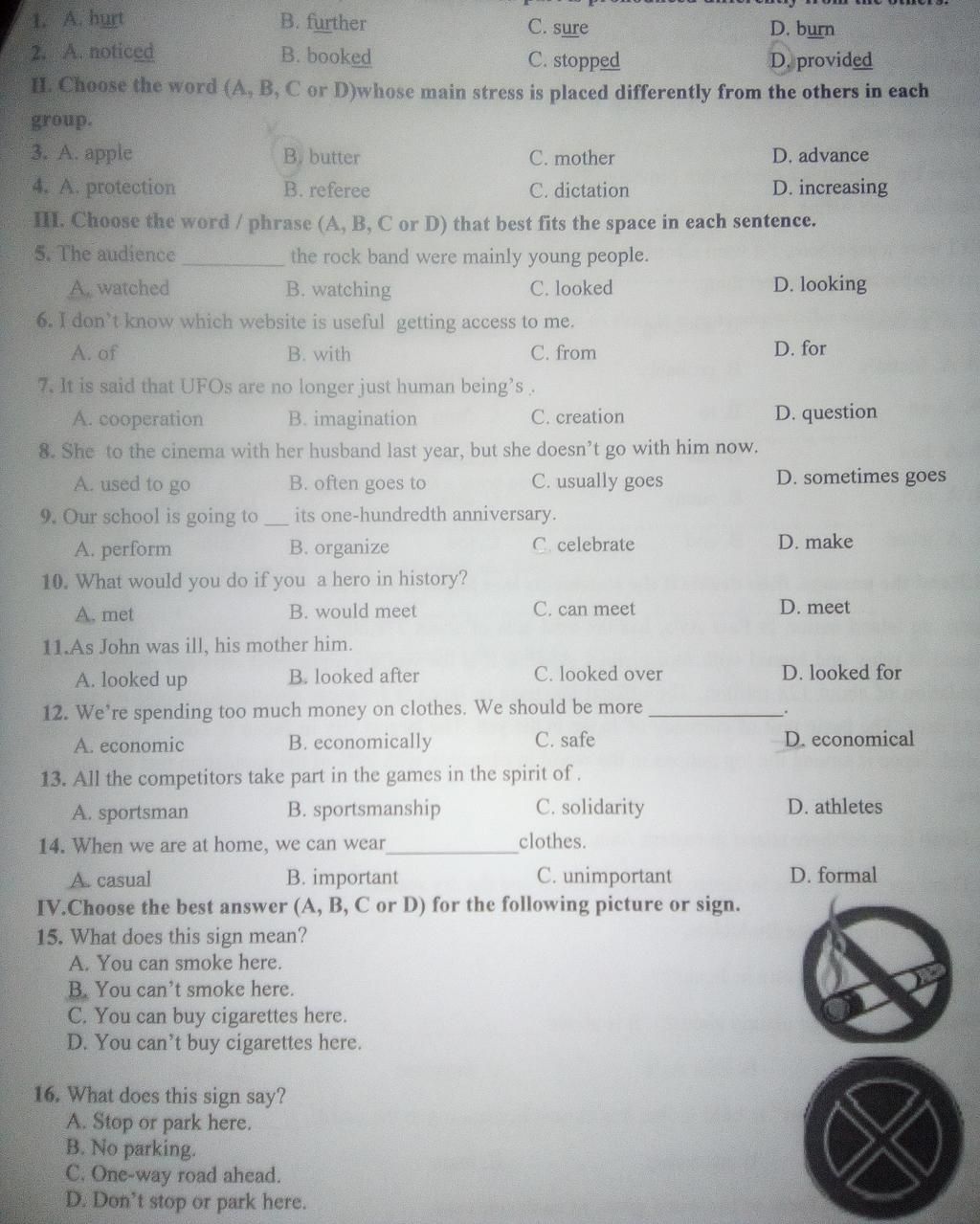 II. Choose the word (A, B, C or D)whose main stress is placed differently from the others in each