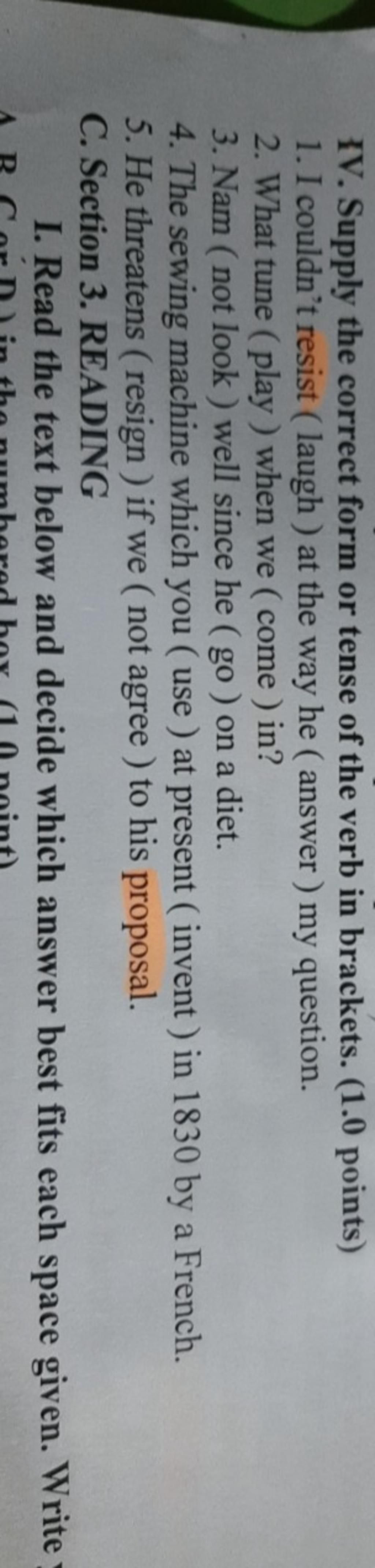 IV. Supply the correct form or tense of the verb in brackets.