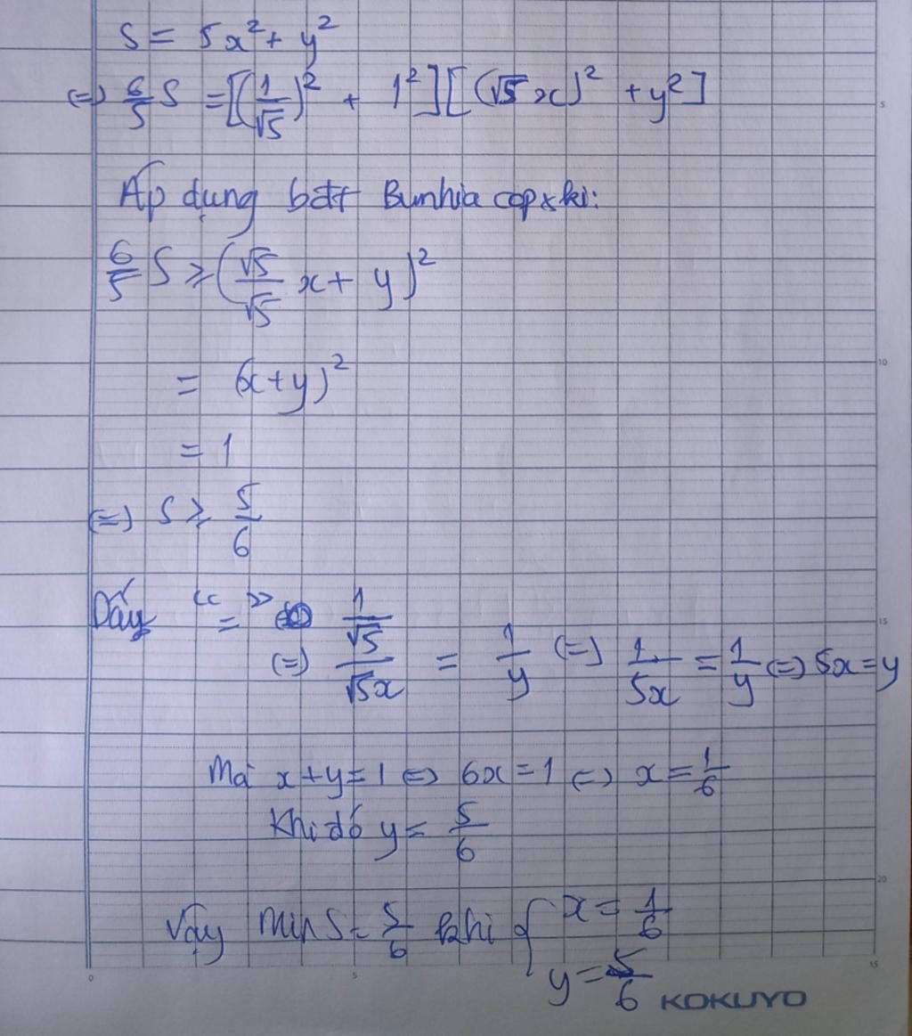 Vậy `text(GTNN)` của `S` là `5/6<=>`$\begin{cases} x=\dfrac{1}{6}\\y=\dfrac{5}{6}\end{cases}$