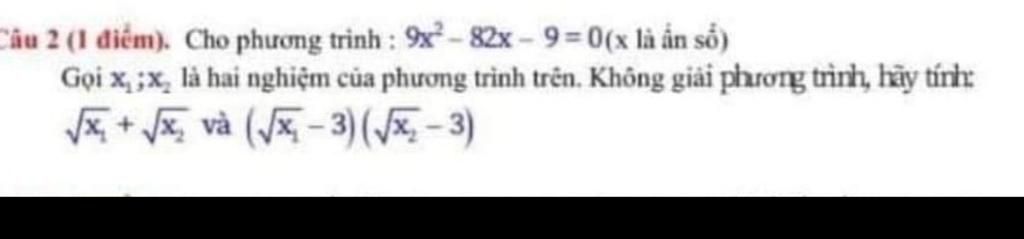 $\begin{array}{l} Viet \to \left\{ \begin{array}{l} {x_1} + {x_2} = \dfrac{{ - b}}{a} = \dfrac{{82}}{9}\\ {x_1}{x_2} = \dfrac{c}{a} = 1 \end{array} \right.\\ \sqrt {{x_1}} + \sqrt {{x_2}} \\ \Rightarrow {\left( {\sqrt {{x_1}} + \sqrt {{x_2}} } \right)^2} = {x_1} + {x_2} + 2\sqrt {{x_1}{x_2}} \\ = \dfrac{{82}}{9} + 2.1 = \dfrac{{100}}{9}\\ \Rightarrow \sqrt {{x_1}} + \sqrt {{x_2}} = \dfrac{{10}}{3}\\ \left( {\sqrt {{x_1}} - 3} \right)\left( {\sqrt {{x_2}} - 3} \right)\\ = \sqrt {{x_1}{x_2}} - 3\left( {\sqrt {{x_1}} + \sqrt {{x_2}} } \right) + 9\\ = 10 - \dfrac{{10}}{3}.3 = 0 \end{array}$