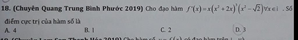 f'(x) ta thấy x=0(nghiệm kép) ,x = -2, x= 1,189207115, x=-1,189207115 là nghiệm của f'(x) do đó có 3 cực trị.