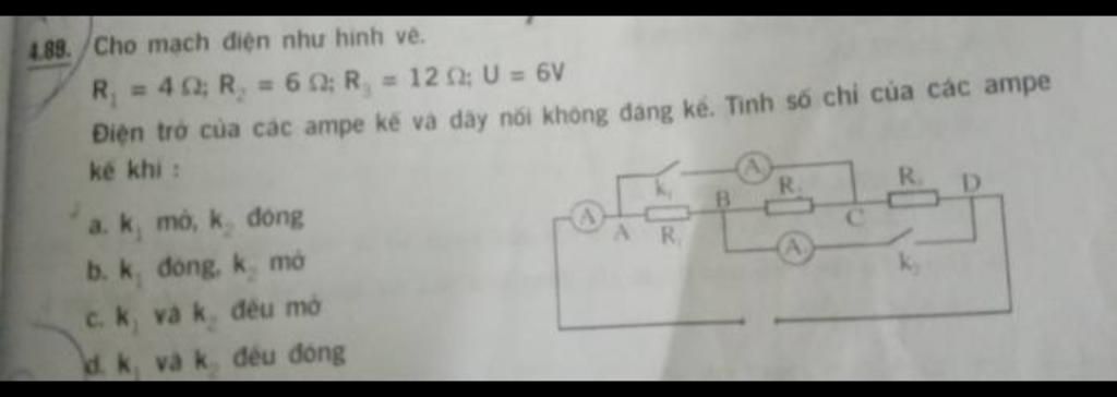 Cho mạch điện như hình vẽ: R1 = 4 ôm ; R2 = 6 ôm ; R3 = 12 ôm ; U = 6V. Điện trở của các ampe kế và dây nối không đáng kể. Tính số chỉ của ampe kế khi: a) k1 mở, k2 đóng ; b) k1 đóng, k2 mở ; c) k1 và k2 đều đóng ; d) k1 và k2 đều mở