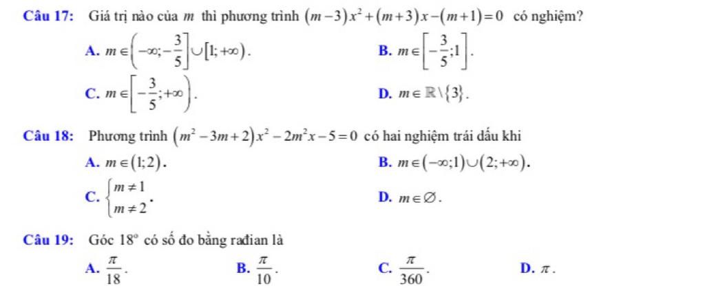 Câu 17: Giá trị nào của m thì phương trình (m -3)x + (m+3)x-(m+1)=D0 có nghiệm?