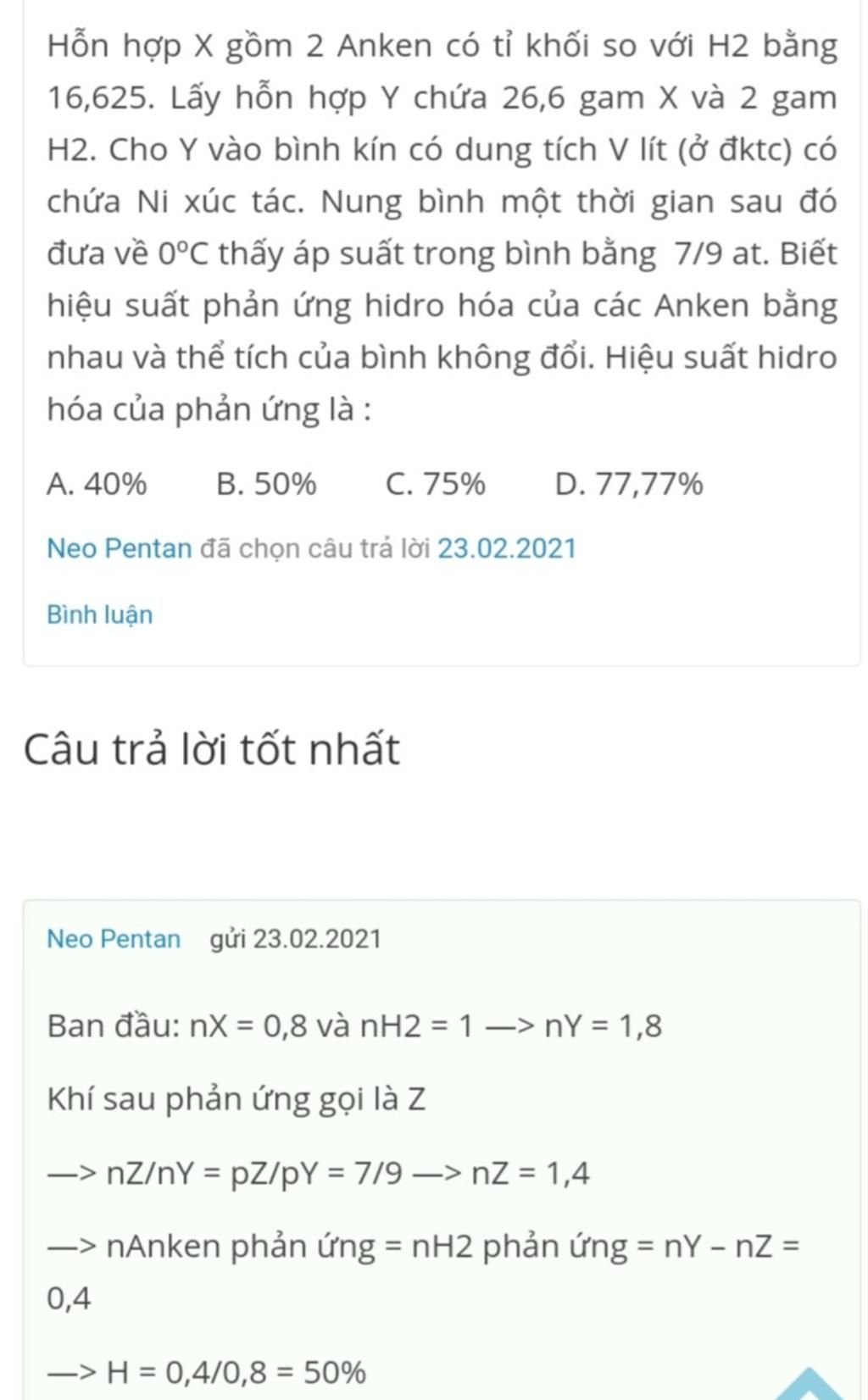 Vì X có số mol 0,8. Hidro có số mol 1. Mà hỗn hợp Y là hỗn hợp giữa X và $H_{2}$ , và lúc đầu khi chưa có xúc tác là niken và nhiệt độ thì X và $H_{2}$ chưa tác dụng với nhau nên số mol trong bình vẫn như thế ⇒ $n_{Y}$ = $n_{X}$ + $n_{H2}$