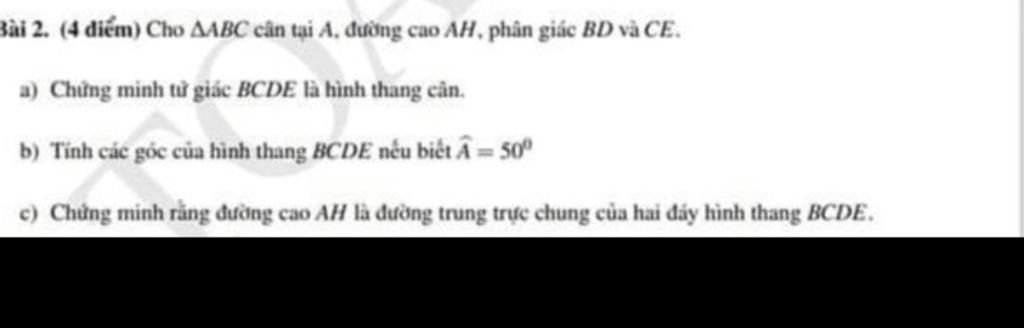 Bài 2. (4 điểm) Cho ΔABC cân tại A, đường cao AH, phân giác BD và CE.