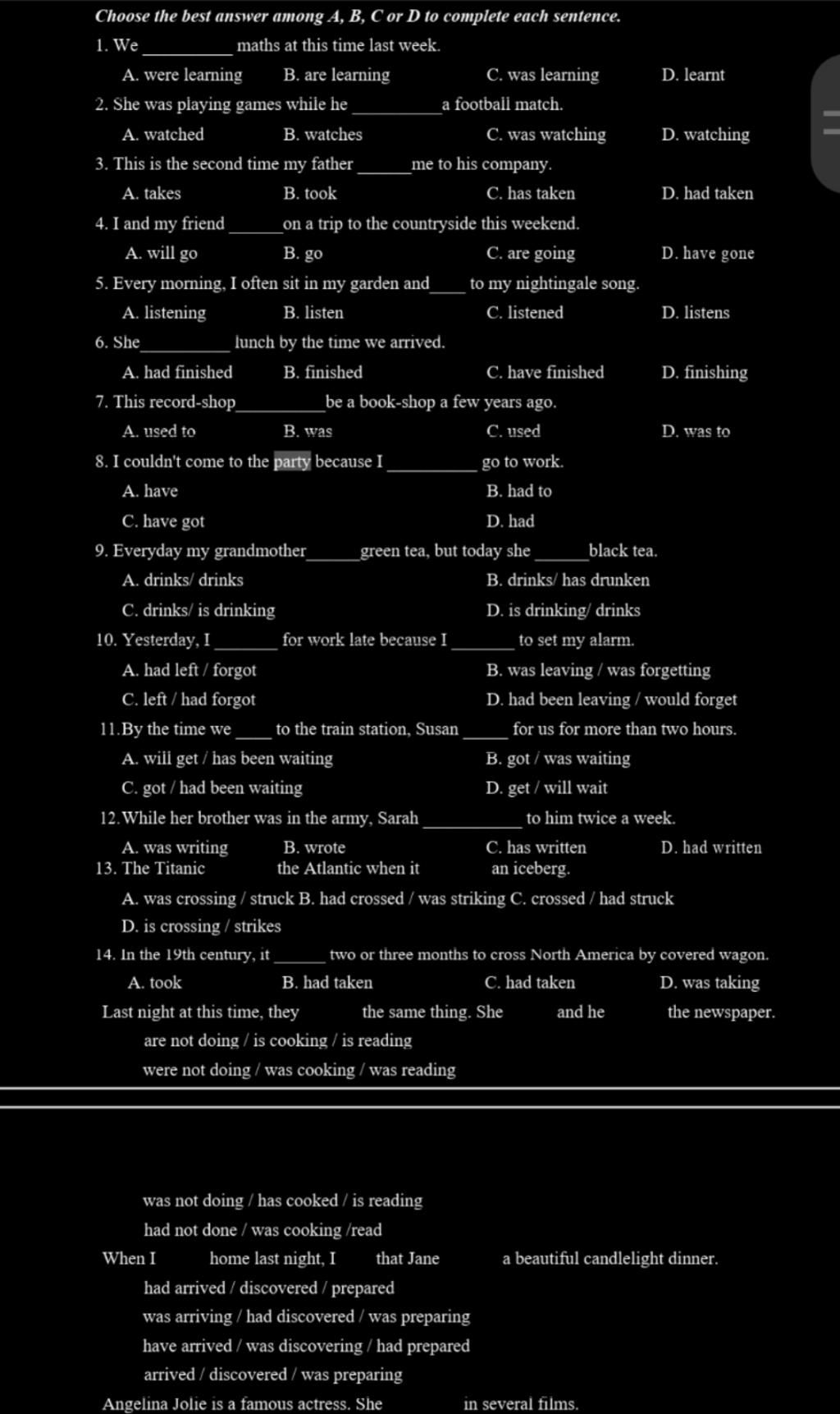 15. were not doing/was cooking/was reading ( last night at this time -> QKTD)
