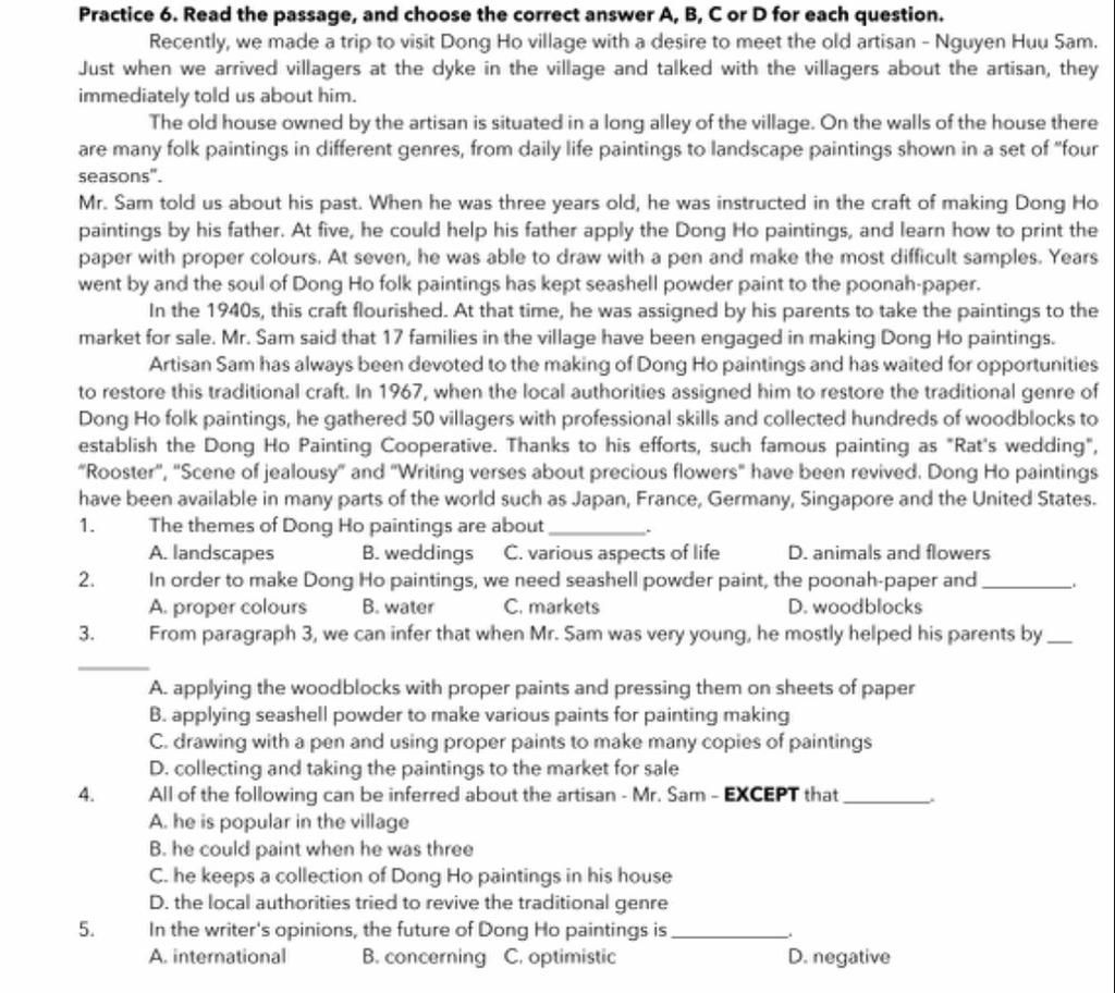 Practice 6. Read the passage, and choose the correct answer A, B, C or D for each question.