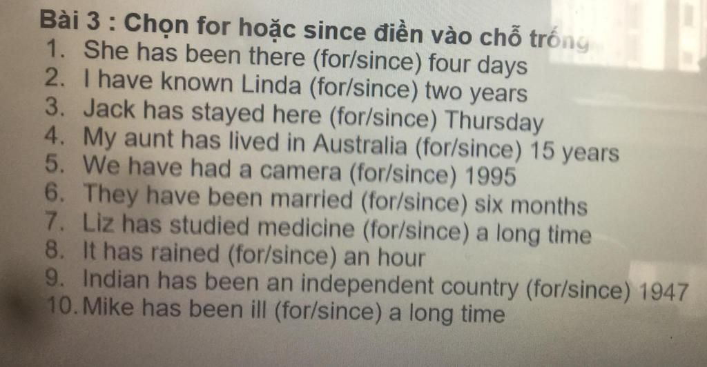 Bài 3: Chọn for hoặc since điền vào chỗ trống