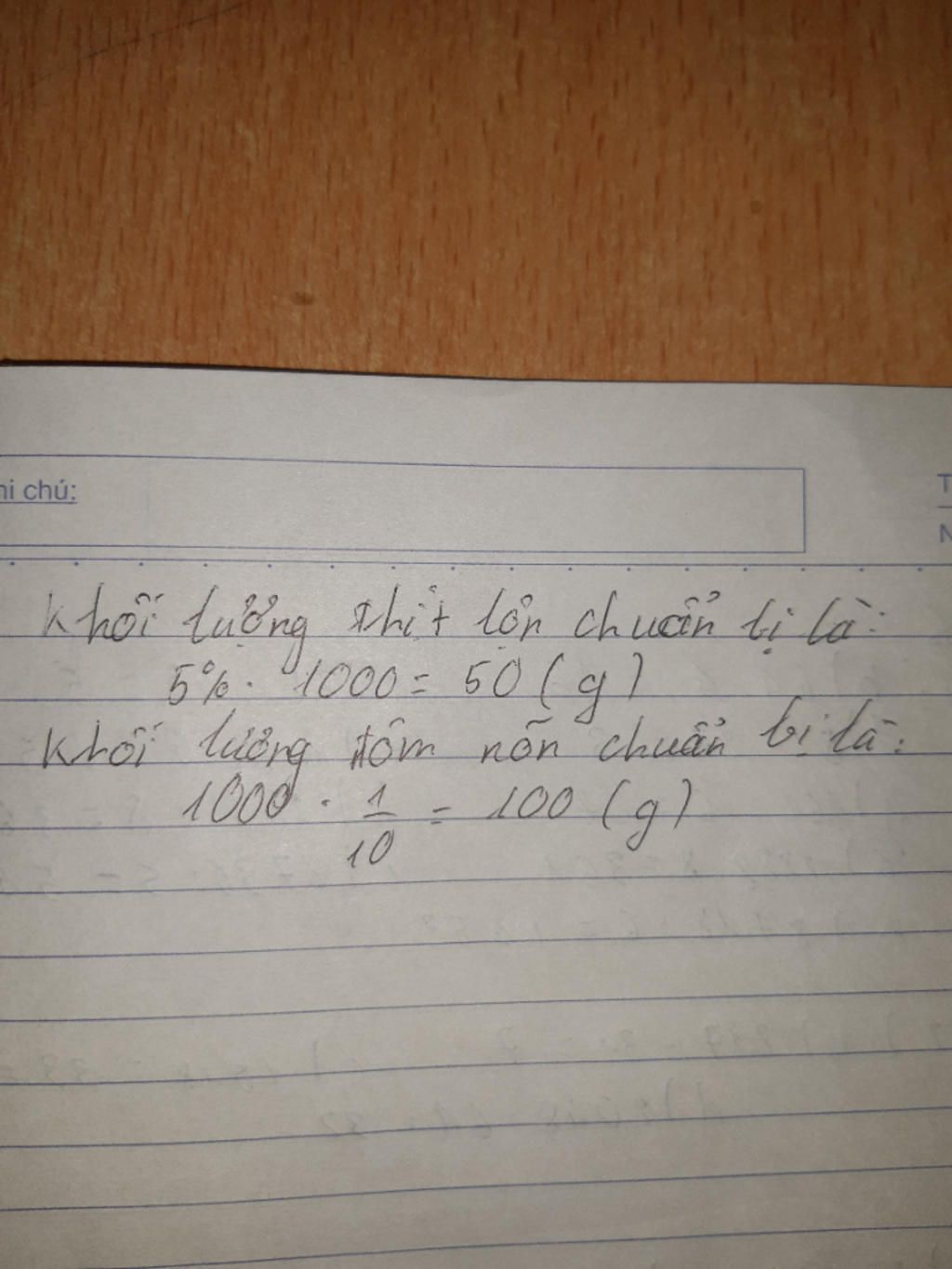 Để làm sản phẩm học tập cho tiết học STEM môn Công nghệ lớp 6, mỗi nhóm học sinh khối 6 đã chuẩn bị nguyên liệu làm món “Nộm rau muống” gồm: Rau muống, thịt lợn, tôm nõn và một số nguyên liệu khác. Trong đó khối lượng thịt lợn và tôm nõn theo thứ tự bằng 5% và khối lượng rau muống. Biết khối lượng rau muống của nhóm bạn Nam chuẩn bị là 1000 gam. Tính khối lượng thịt lợn và tôm nõn mà nhóm bạn Nam đã chuẩn bị.