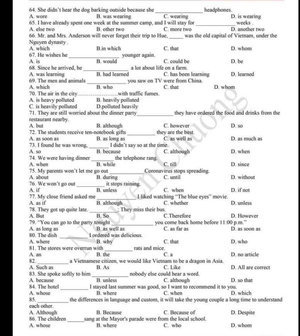 Tương tự câu 64 dùng thì quá khứ tiếp diễn.