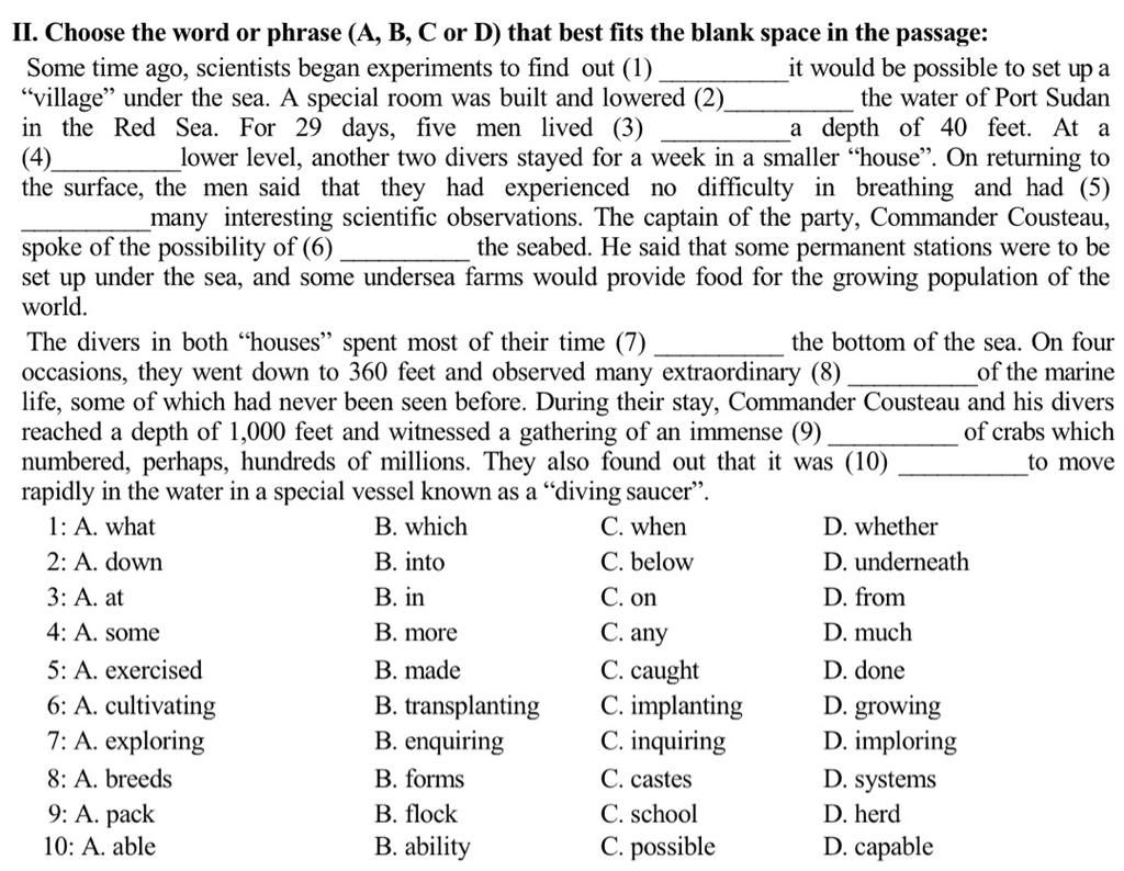 II. Choose the word or phrase (A, B, C or D) that best fits the blank space in the passage: