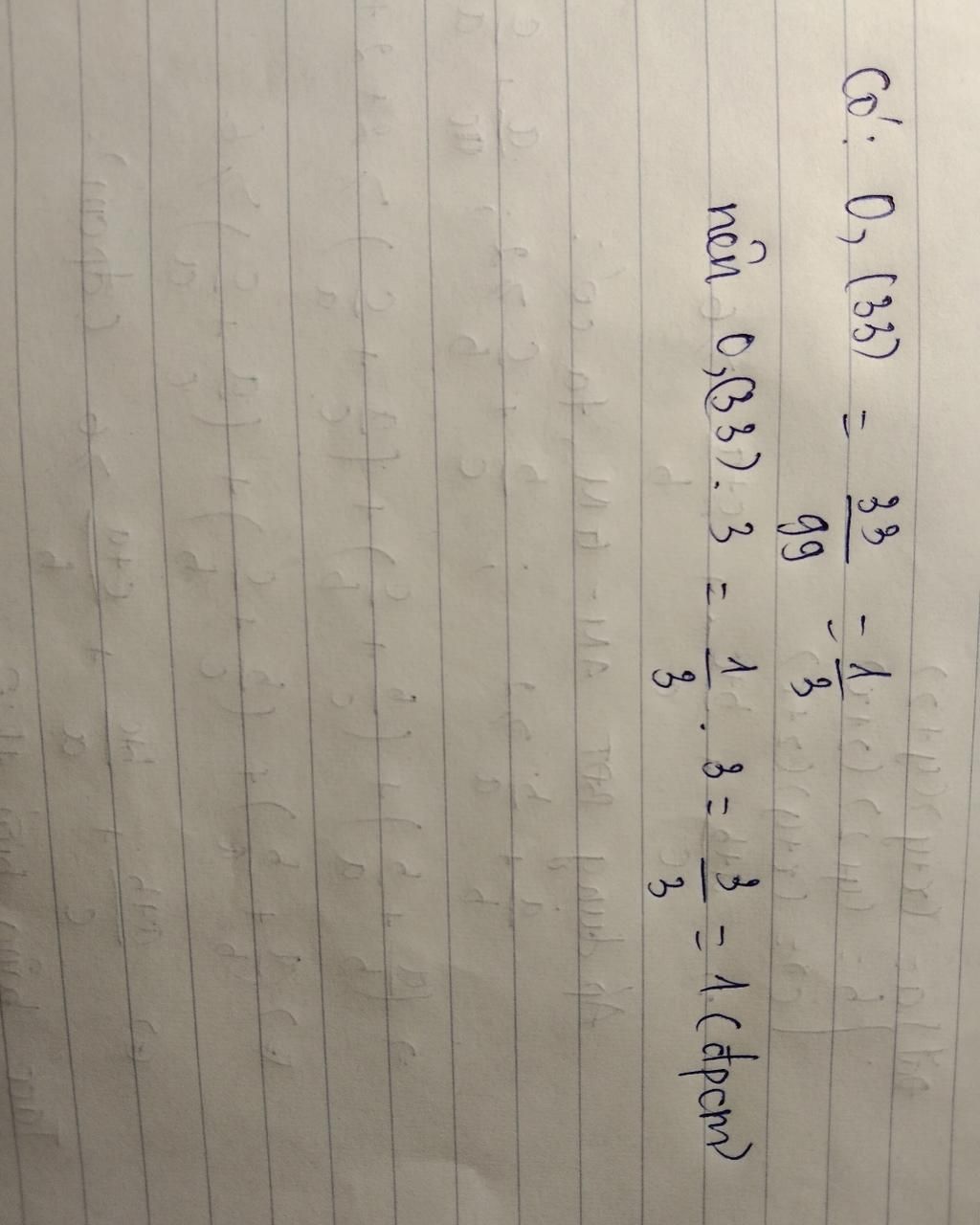 `Vậy:` `0,(33)xx3=1/3xx3=1`