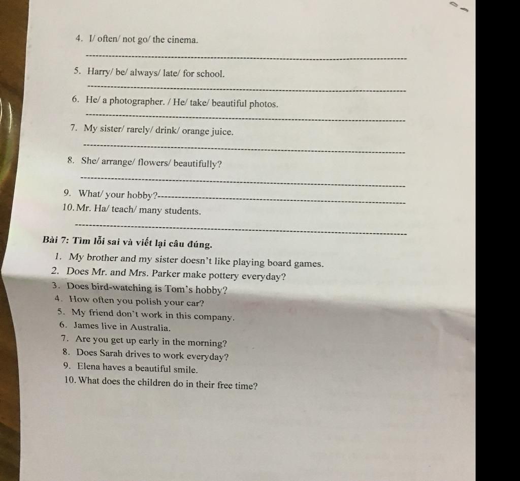 Bổ sung: 1. Doesn't `->` don't 2. Does `->` do 3. Does bird-watching is 4. You `->` do you 5. Don't `->` doesn't 6. Live `->` lives 7. Are `->` do