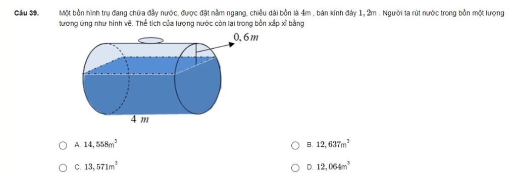 Một bồn hình trụ đang chứa đày nước, được đặt nằm ngang, chiều dài bồn là 4m , bán kính đáy 1, 2m . Người ta rút nước trong bồn một lượng