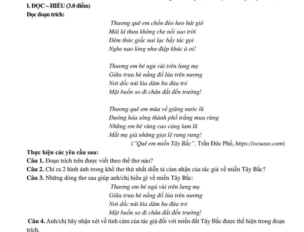 Câu 4. Nhận xét về tình cảm của tác giả: qua bài thơ trên, ta có thể thấy được sự thương cảm, xót xa mà tác giả dành cho miền đất Tây Bắc. Đây là những tình cảm cao đẹp thể hiện lòng trắc ẩn và tinh thần tương thân tương ái.