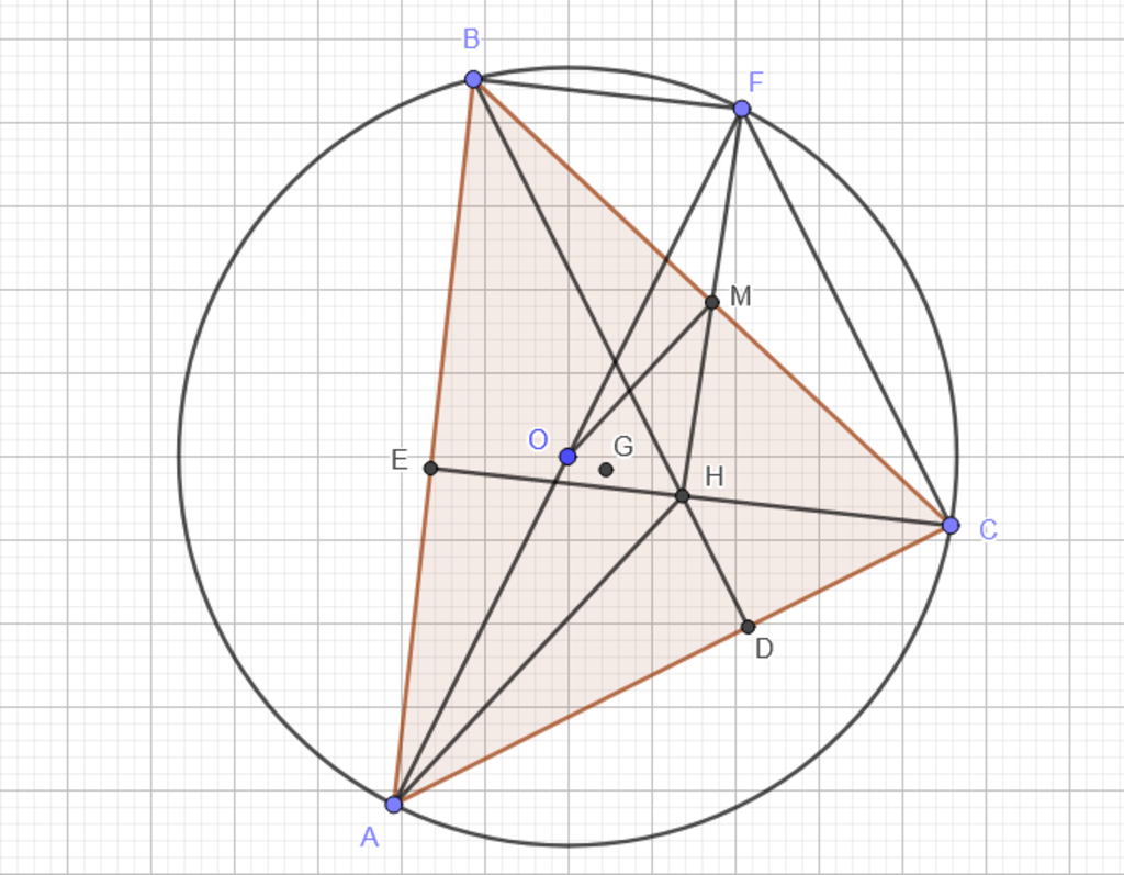 d) Do G là trọng tâm của $\Delta AHF$ và $M$ là trung điểm của $HF$ $\Rightarrow\dfrac{AG}{AM}=\dfrac{2}{3}$ mà $M$ là trung điểm của $BC$