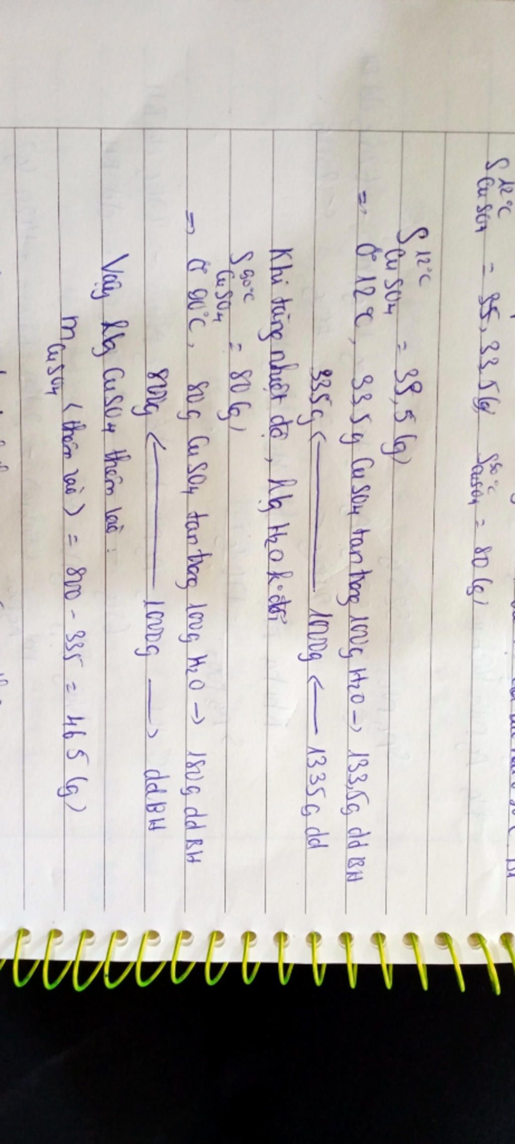 "Cứ 100g nước hòa tan 33,5g CuSO4 tạo thành 133,5g dd bão hòa. Cứ x g nước hòa tan y g CuSO4 tạo thành 1335 dd bão hòa" Trong 1335 gam dung dịch có 335 gam CuSO4 suy ra có 1335-335=1000 gam nước