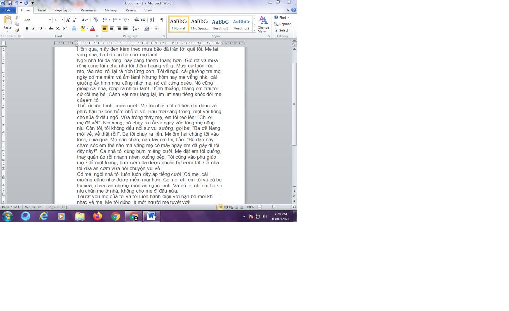 Ông ngoại tôi bị bệnh, uống thuốc mãi chẳng đỡ. Mẹ tôi nghe vậy xót lắm, mẹ quyết đi đến nhà chăm sóc cho ông. Một ngày, rồi hai ngày, một tuần đã trôi qua, sao mẽ tôi vẫn chưa về? Nhà ông bà không lắp ti vi hay sắm một chiếc đài vì ông bà cũng chỉ có đi ra đồng, ra chợ. Cũng vì vậy ngày mẹ tôi trở về nhà, ông bà cũng không hề biết là có bão mà ngăn mẹ tôi lại. Tầm 9 giờ, mẹ kéo chăn lên cho ông, dặn bà hôm sau cho ông uống thuốc rồi xin phép ra về. Trên đường về, sấm chớp cứ đùng đùng nhưng mẹ tôi chẳng quan tâm vì nghĩ là sắp mưa. Càng lúc, gió lại càng một to hơn, bụi ngoài đường dần bay mịt mù, mưa xuống. Mẹ tôi lại không mang áo mưa, mẹ cố phi xe về nhanh nhất có thể. Mẹ muốn về nhà một cách "bí mật" để chúng tôi bất ngờ. Hôm ấy, cha con tôi cũng không ngủ được, tôi thủ thỉ hỏi: "Ba ơi, sắp bão rồi ạ? Không biết mẹ với ông bà có sao không ba?". Ba tôi chấn an tôi và ôm tôi thật chặt, hai người quyết định gọi cho mẹ để xem mẹ có ổn không. Nhưng mẹ tôi lại không bắt máy, nhận thấy có điều chẳng lành, nhưng ba không thể tôi ở nhà một mình được. Mưa ngày càng lớn và dần chuyển sang bão, cơ thể mẹ tôi dầm mưa đến ướt đẫm. Đi được nửa đường thì xe chết máy, sao lại là vào lúc này chứ, xung quanh chẳng có chỗ sửa cũng không có nhà nào có thể trú mưa, mẹ tôi đành dắt bộ xe về nhà. Nửa tiếng trôi qua, hai cha con tôi vẫn ngồi ở ngoài phòng khách chờ mẹ về. Bỗng dưng, tiếng cổng mở ra, hai cha con vội mở đèn chạy ra. Ôi mẹ đã về, mẹ về thật rồi. Tôi mừng quýnh chẳng ngại người mẹ tôi còn ướt nước mưa mà chạy đến ôm mẹ, bố tôi thì giúp mẹ mang xe vào nhà. Tôi hỏi mẹ liên tục mà chẳng màng đến việc mẹ tôi có trả lời hết không. Mẹ khẽ gỡ tôi ra và hôn lên trán tôi. Ba tôi thủ thỉ: "Mẹ về rồi thì vào thay đồ đi nhé, dính nước mưa sẽ bị cảm lạnh". Rồi hai ba con tôi cứ ngồi chơi như vậy cho đến khi mẹ bước ra, cả nhà khi ấy mới để ý bão đã hết từ khi nào. Gia đình tôi quây quần với nhau thật vui vẻ và cùng nhau chìm vào giấc ngủ cho đến sáng.