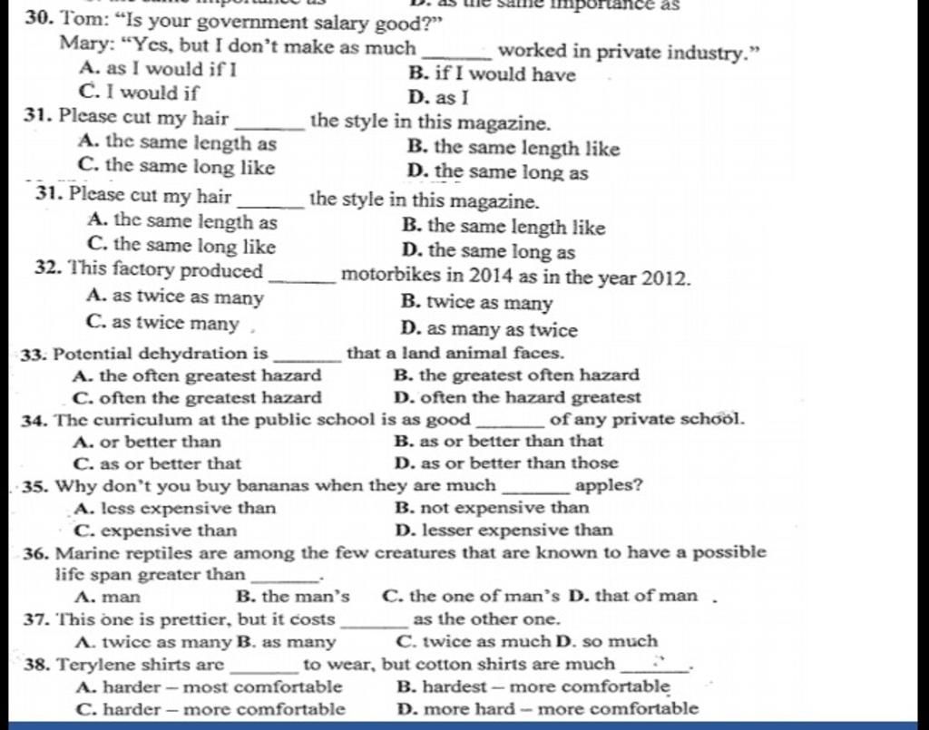 - as much… => sau đó phải là as…. để tạo thành cấu trúc so sánh bằng => loại B,C