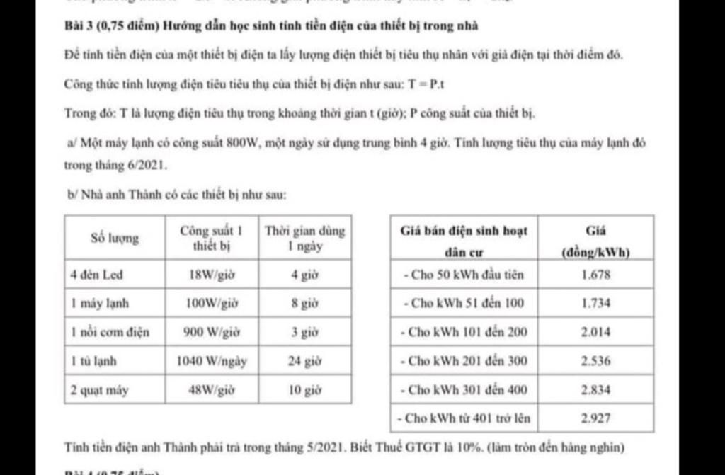 Số tiền điện anh Thành phải trả trong đó bao gồm thuế `10%` là: