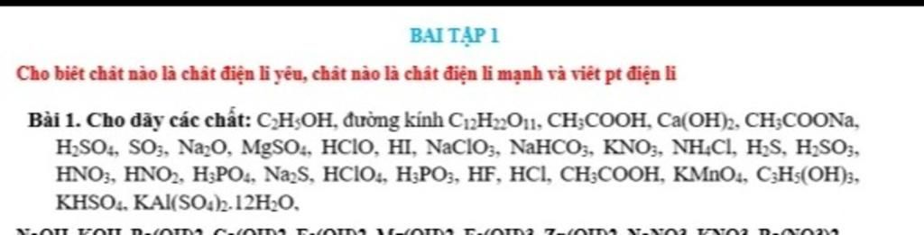 Các chất điện li mạnh: Ca(OH)2, CH3COONa, H2SO4, MgSO4, HI, NaClO3, NaHCO3, KNO3, NH4Cl, HNO3, Na2S, HClO4, HCl, KMnO4, KHSO4, KAl(SO4)2.12H2O.