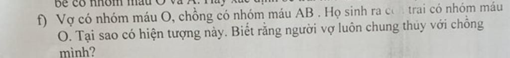 + Người vợ có nhóm máu O, nếu giảm phân bình thường sẽ tạo ra chỉ 1 loại giao tử $I^{O}$. Nhưng do đột biến trong giảm phân dẫn đến tạo ra 2 loại giao tử là $I^{O}I^{O}$ và O.