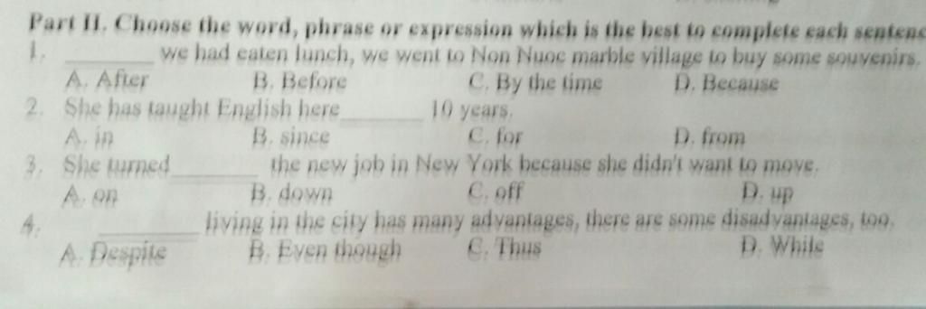 Part II. Choose the word, phrase or expression which is the best to complete each sentenc