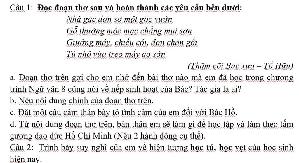 a)Đoạn thơ trên gợi cho em nhớ đến bài thơ:Tức cảnh Pác Bó nói về nếp sống sinh hoạt của Bác