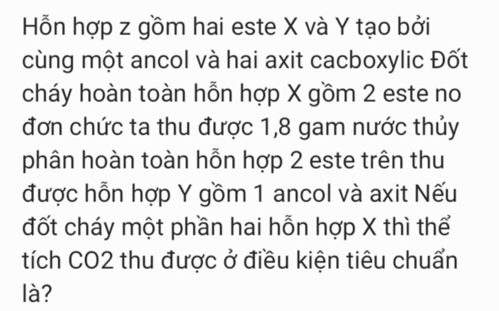 Đề (tóm lược): hỗn hợp $Z$ gồm hai este no, đơn, hở tạo bởi một ancol và hai axit cacboxylic. Đốt cháy hoàn toàn hỗn hợp $Z$ thu được $1,8$ gam nước. Đốt cháy $\dfrac{1}{2}$ hỗn hợp $X$ thì thu được bao nhiêu lít $CO_2$ đktc?