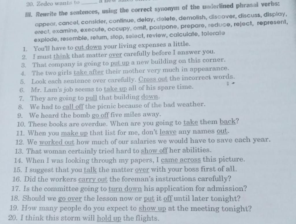 18. Should we examine-postpone the lesson now or put it off until later tonight?