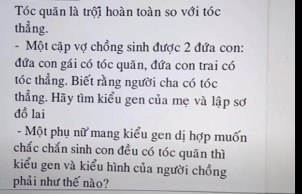 b) Ông D tóc thẳng - mang kiểu gen aa Đứa con gái tóc xoăn - mang kiểu gen Aa hoặc AA. Mà ông D chỉ tạo giao tử a – đứa con gái mang kiểu gen Aa - Đứa Con gái nhận 1 giao tử A từ mẹ