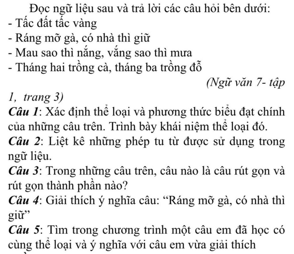 - Tục ngữ : là những câu nói dân gian ngắn gọn, ổn định, có hình ảnh, nhịp điệu. Thể hiện kinh nghiệm của nhân dân về mọi mặt (tự nhiên, lao động sản xuất, xã hội) được nhân dân vận dụng vào trong đời sống, suy nghĩ và lời ăn tiếng nói hàng ngày. Đây là 1 thể loại của văn học dân gian.