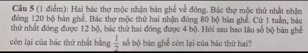 Vì số bàn ghế còn lại của bác thứ nhất bằng $\dfrac 1 2$ của bác thứ hai nên giả sử bác thứ nhất nhận gấp đôi số bộ bàn ghế và trong tuần số bộ đóng được gấp 2 lần thì số bàn ghế còn lại sẽ bằng của bác thứ 2.