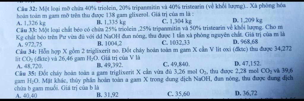 Câu 32: Một loại mỡ chứa 40% triolein, 20% tripanmitin và 40% tristearin (về khối lượng).. Xà phòng hóa