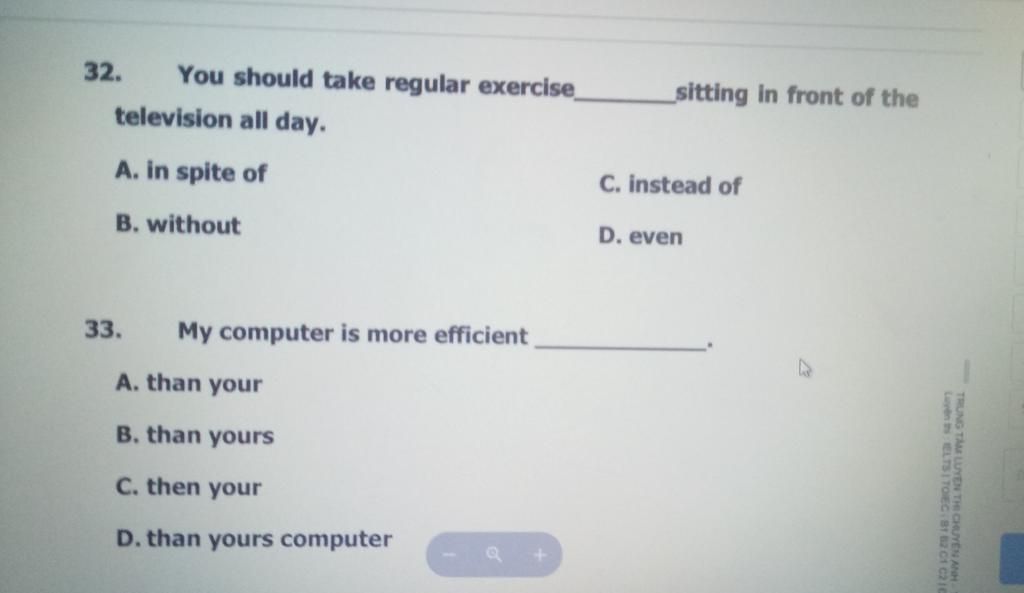 `33`. B than yours ( yours = your computer: tính từ sở hữu + N )