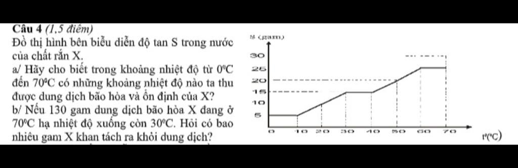 Từ $0^oC\to 70^oC$: các khoảng $0^oC-10^oC$, $30^oC-40^oC$, $60^C-70^oC$, độ tan của $X$ không đổi nên dung dịch thu được bão hoà, ổn định.