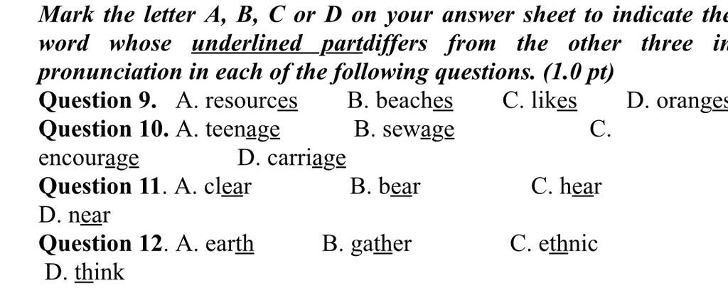 $10.$ A (Vì B, C và D đuôi age phát âm là /ɪdʒ/ còn A phát âm là /eɪdʒ/)