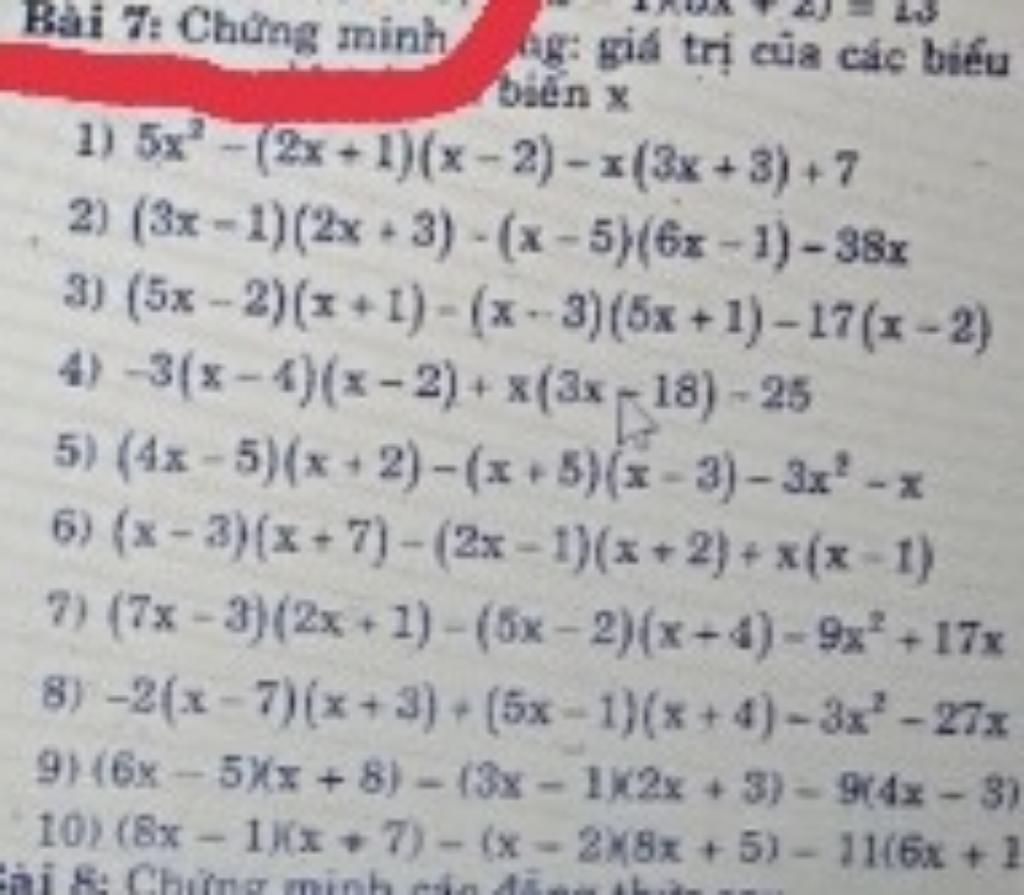 1/. 5x² - (2x + 1)(x - 2) - x(3x +3) + 7