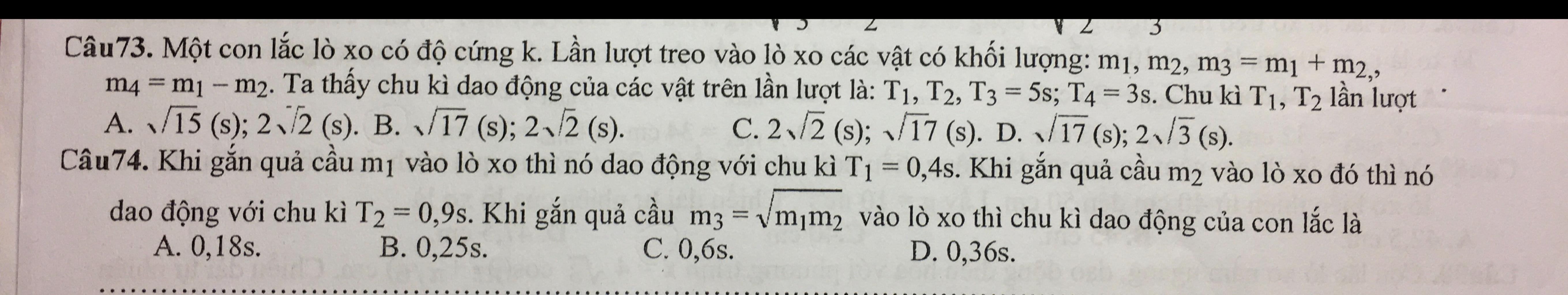 Câu73. Một con lắc lò xo có độ cứng k. Lần lượt treo vào lò xo các vật có khôi lượng: m1, m2, m3 = m1 + m2.,